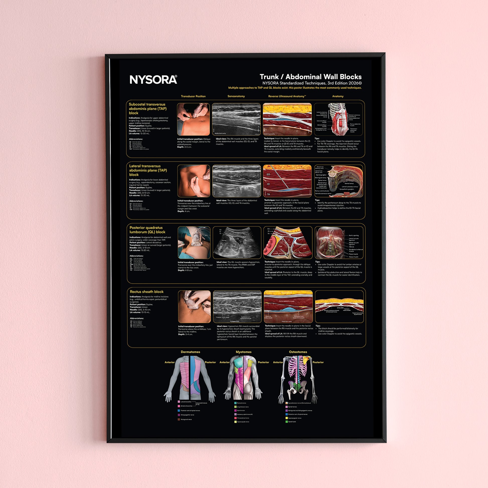 NYSORA’s trunk and abdominal wall blocks poster, featuring standardized techniques from the best-selling Nerve Block Manual Deluxe and Nerve Blocks app, trusted worldwide for ultrasound-guided regional anesthesia education.