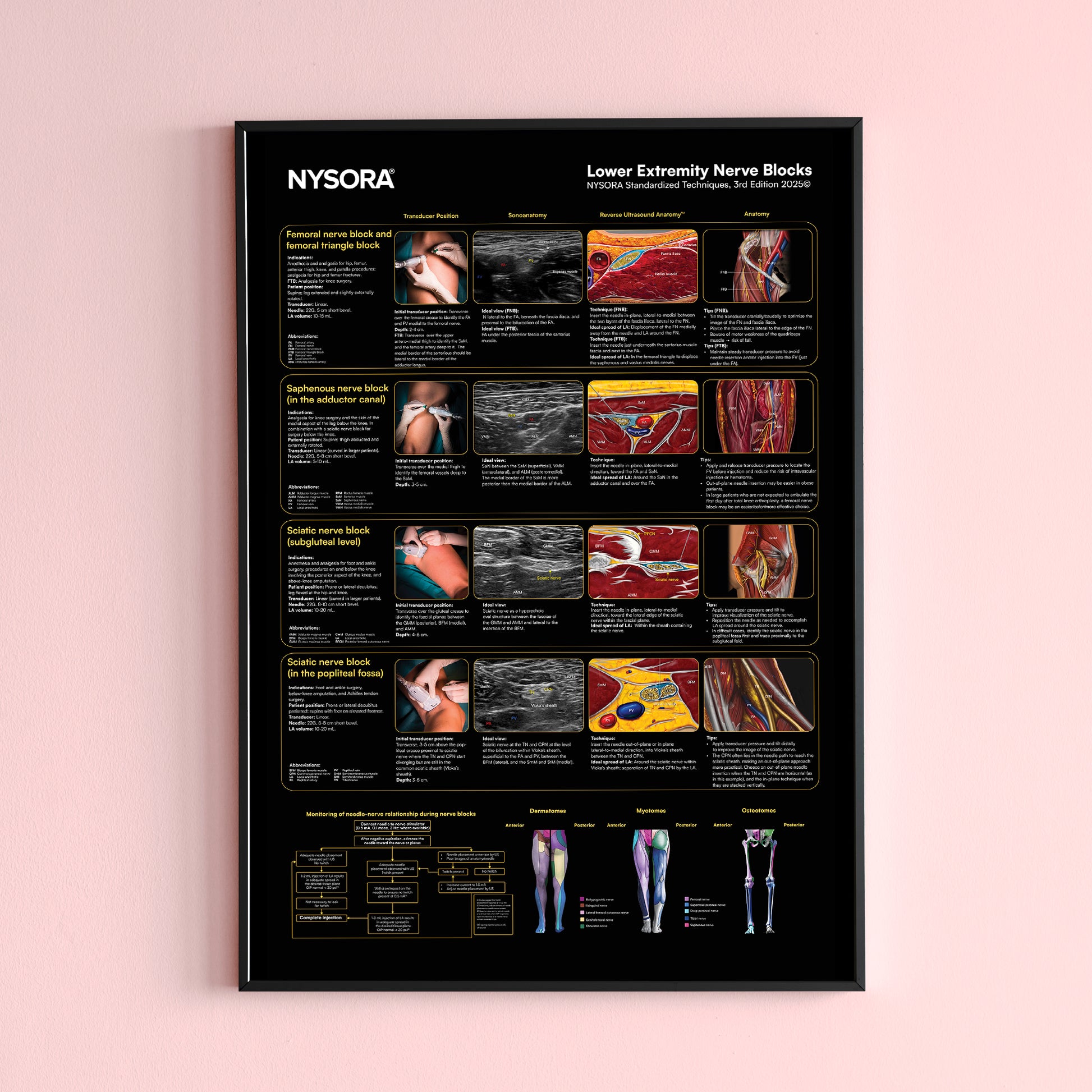 An updated and redesigned version of NYSORA’s lower extremity nerve blocks poster, featuring standardized techniques from the best-selling Nerve Block Manual Deluxe and Nerve Blocks App, trusted worldwide for ultrasound-guided regional anesthesia education.